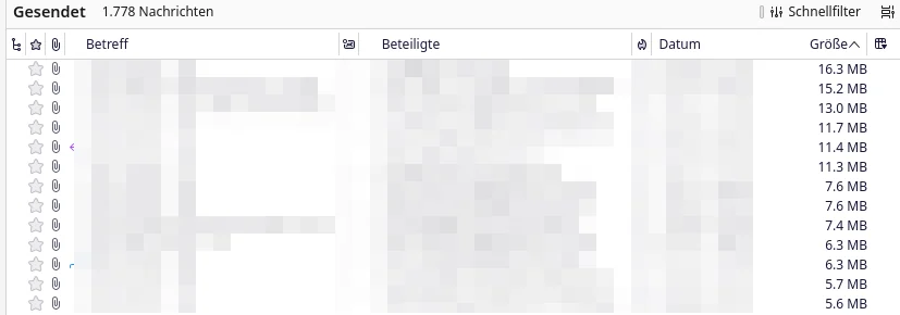 Der Ordner „Gesendet“ hat fast ausschließlich E-Mails mit Anhängen, die eine Kopie der Datei enthält die schon auf dem Computer vorhanden ist, beispielsweise eine Rechnung. Also auch hier können die Anhänge alle entfernt werden, denn die Text-Information als E-Mail bleibt erhalten und damit auch der Nachweis des Versands.